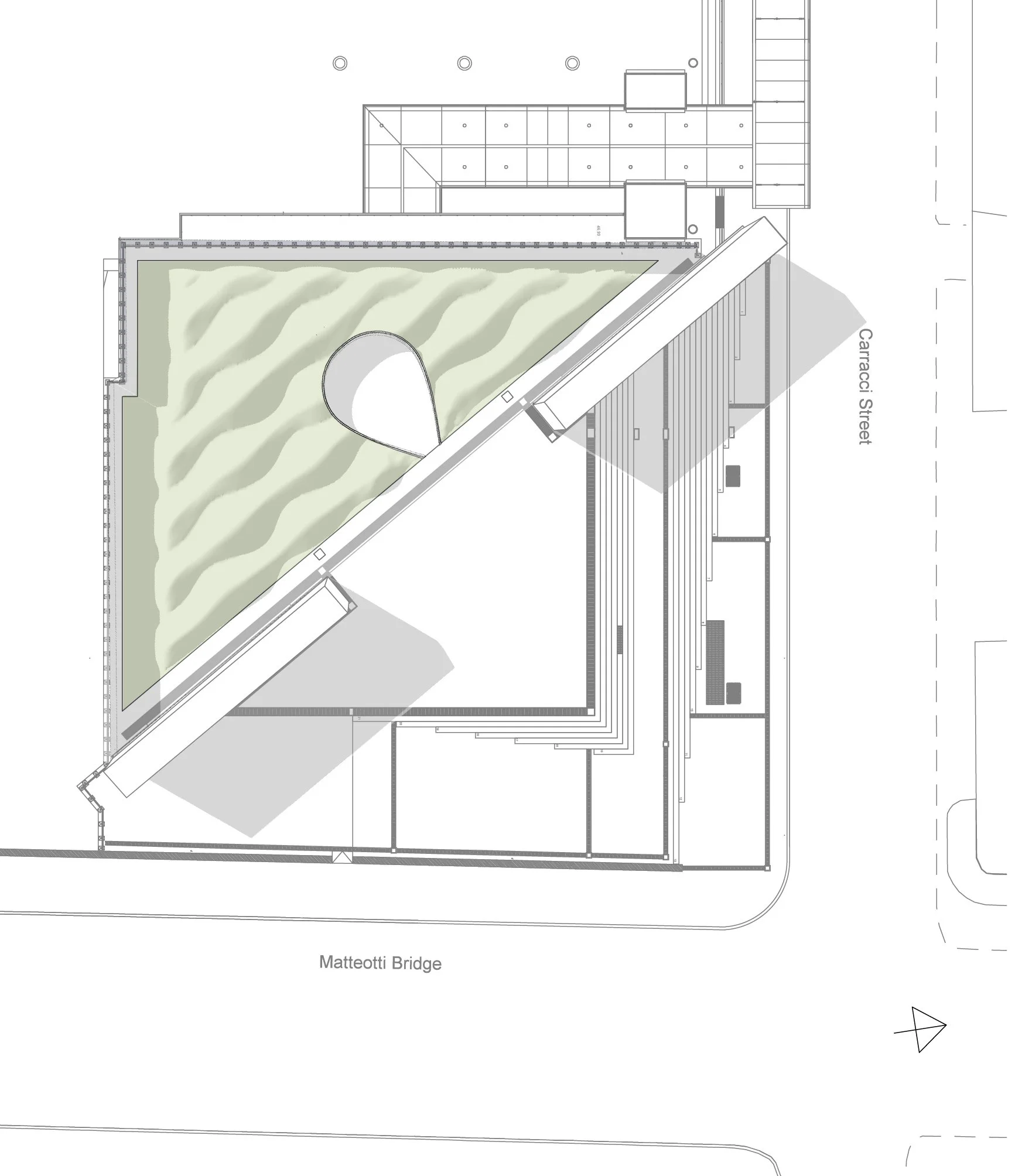 “Despite its central location close to the city of Bologna the memorial provides a tranquil place for meditation, reflection and prayer for people passing by. The existing walls and fences create a border between the memorial and its surroundings, making it to its own sacred place, an enclosed garden, a hortus conclusus. The memorial consists of two parts, a vast undulating grass meadow and a small enclosed room. The sweeping grass formation of the meadow resembles the ocean and is in contrast with the adjacent flat paved square.