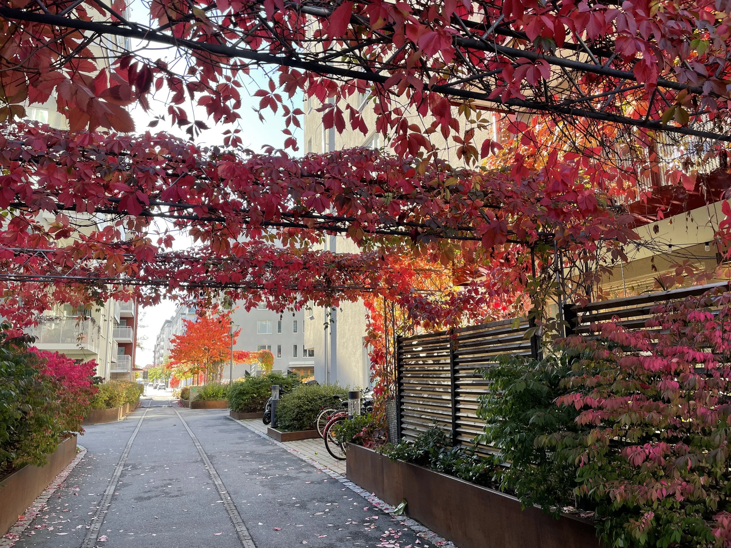 Gården är underbyggd med parkering, stort fokus lades på att skapa en grönskande gård trots begränsade möjligheter till laster. Kopplingen till det gamla industriområdet inspirerade till pergola och spaljéer av fackverk.
